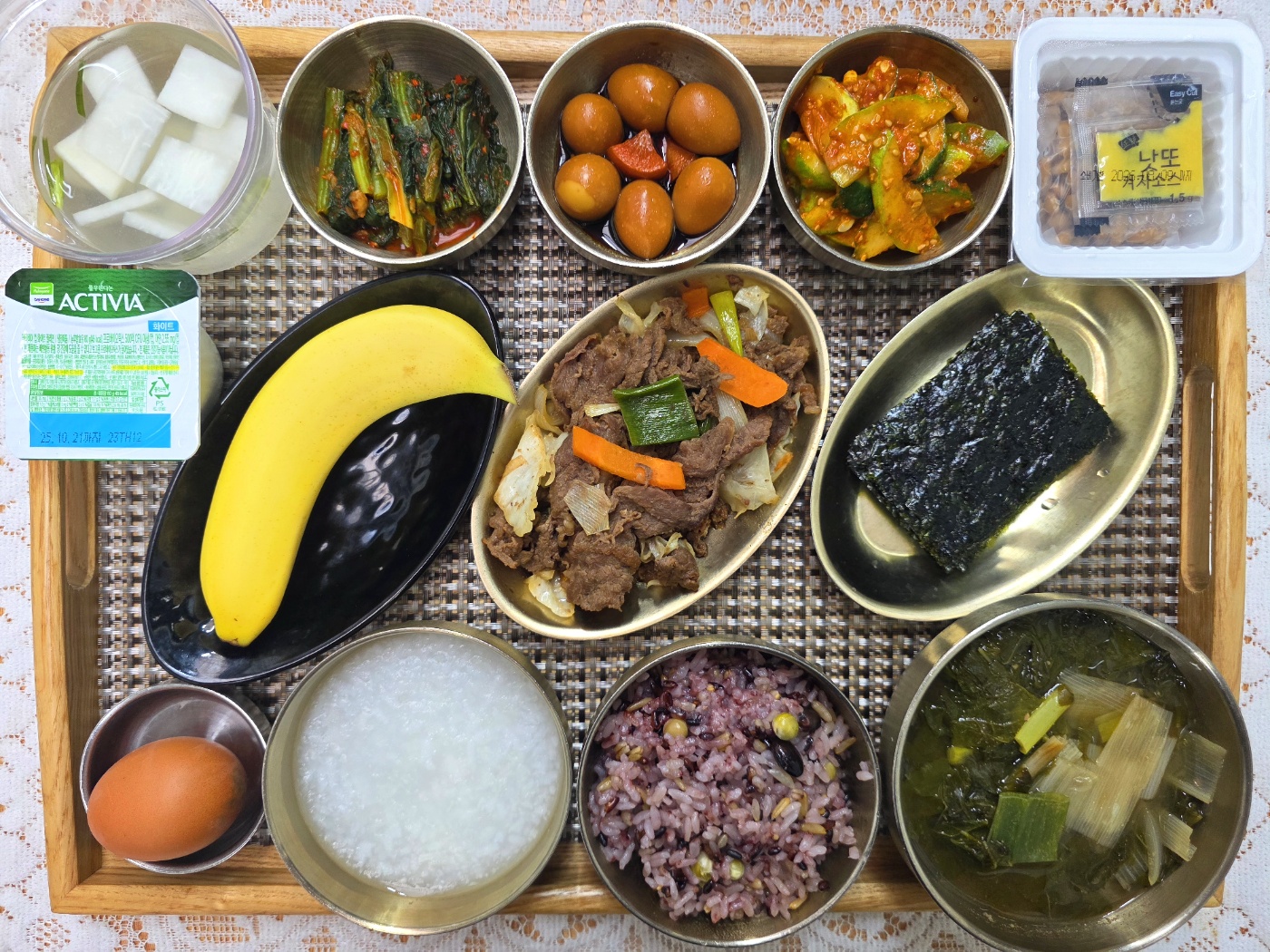 잡곡밥/죽/아욱된장국/한우불고기/메추리알조림/낫또&김/오이생채/갓김치/나박김치/바나나/계란/요거트
