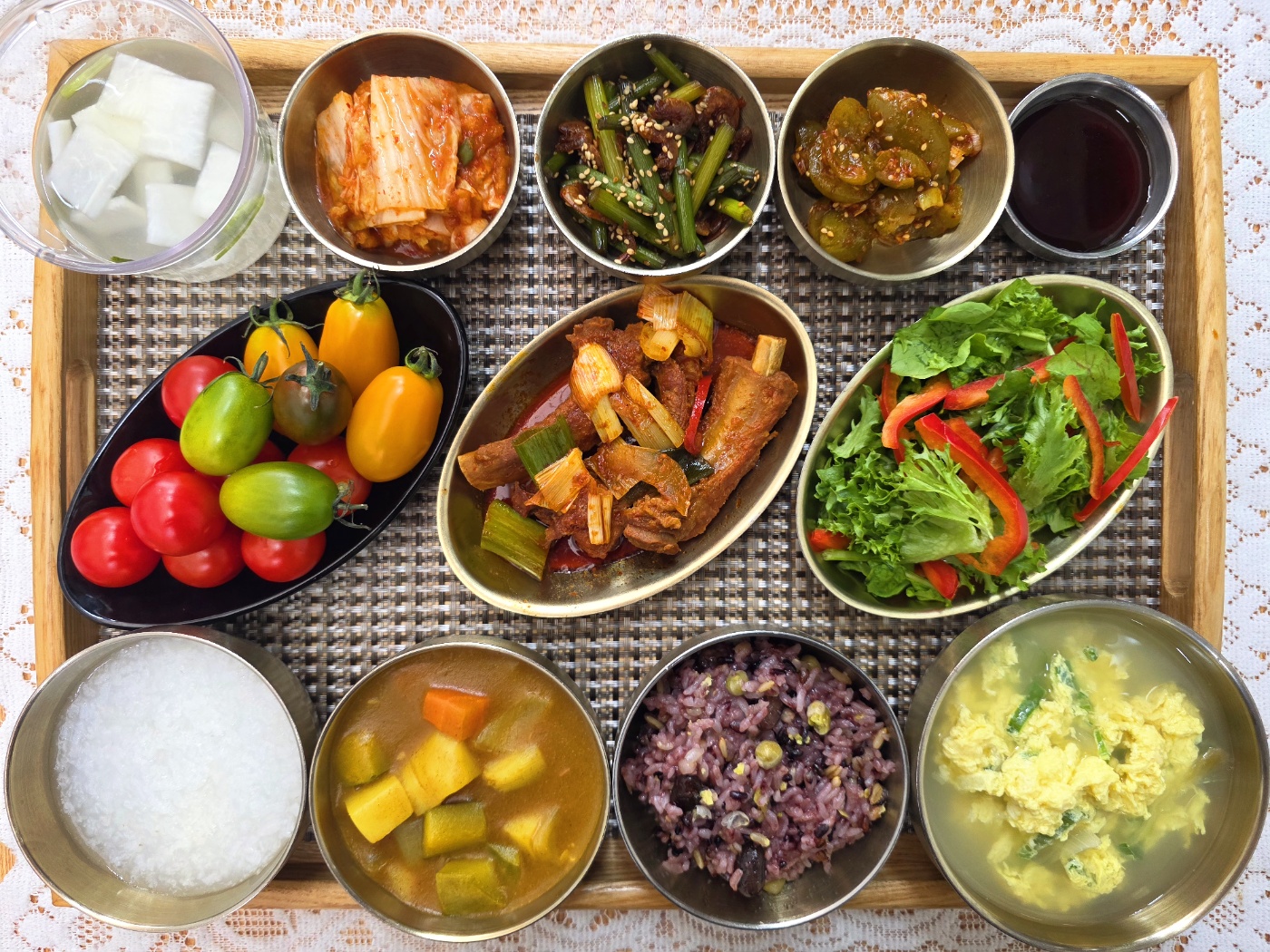 잡곡밥/영양죽/계란국/등갈비찜/일식카레소스/건새우마늘쫑볶음/매실무침/루꼴라샐러드&드레싱/포기김치/나박김치/계절과일