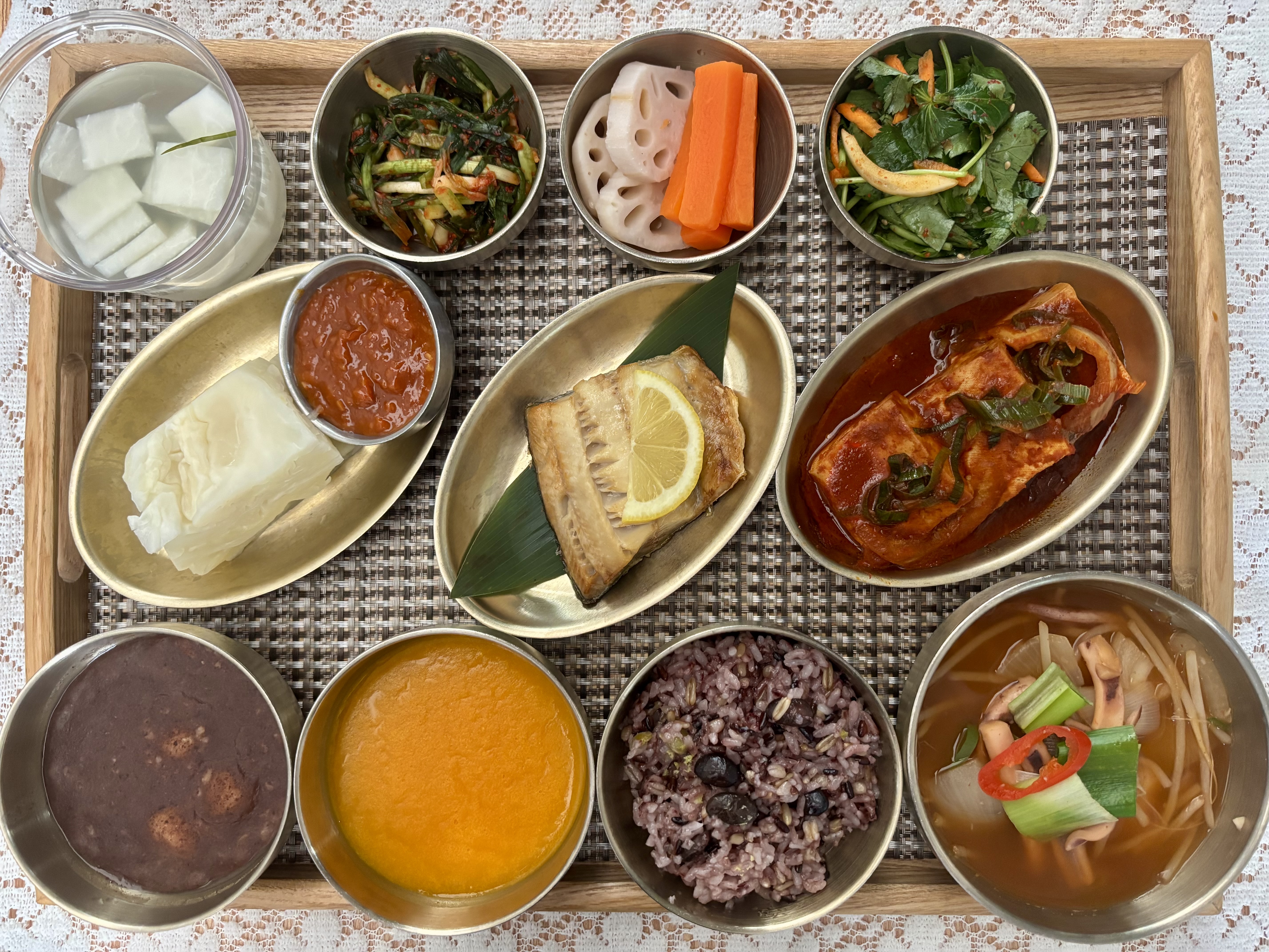 잡곡밥/영양죽/오징어국/임연수구이/두부조림/양배추쌈&쌈장/참나물생채/파김치/나박김치/숙당근&숙연근/팥죽