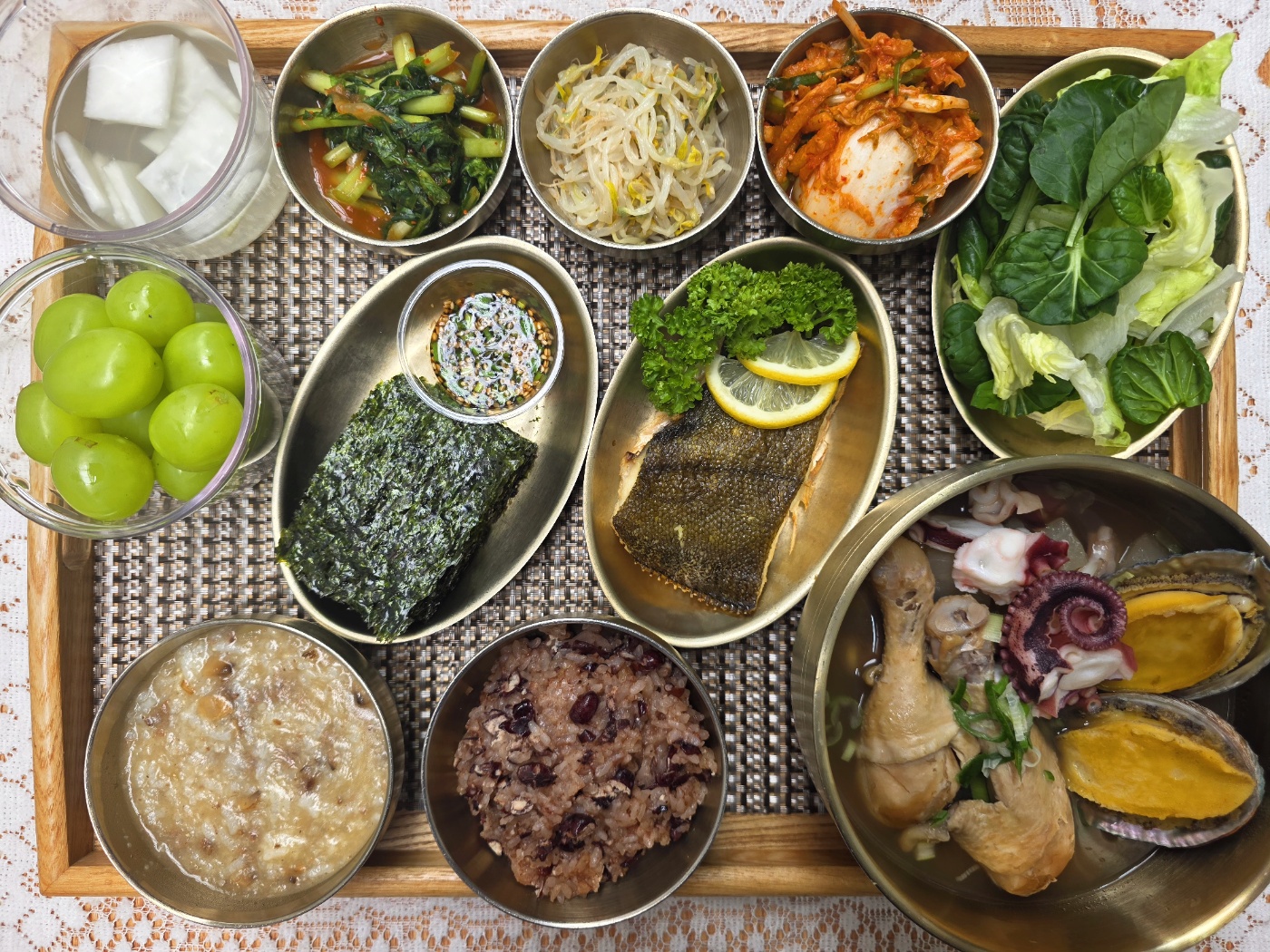 찹쌀팥밥/영양죽/해신탕/가자미구이/구운김/배추겉절이/숙주나물/그린샐러드&드레싱/열무김치/나박김치/계절과일