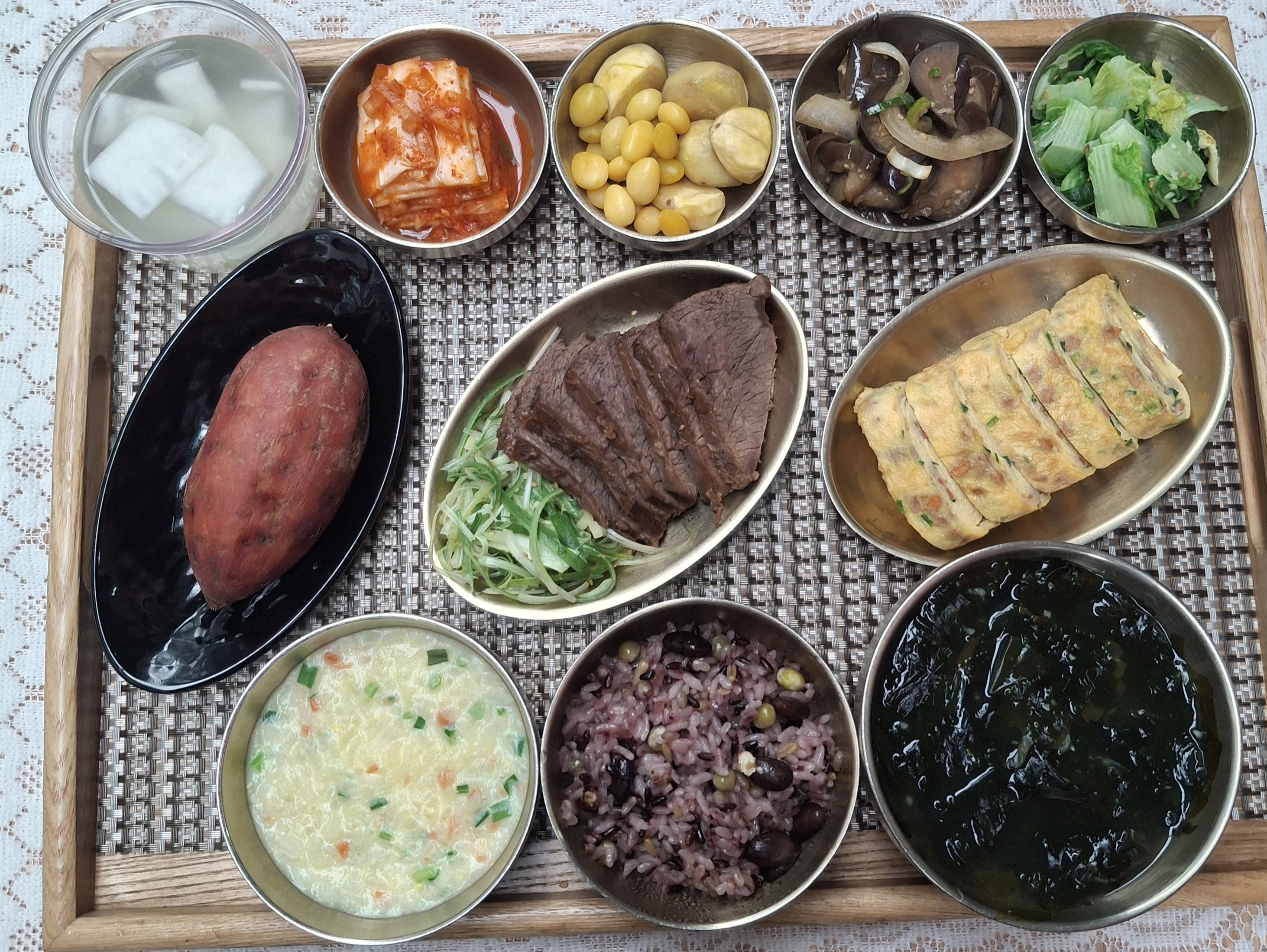 잡곡밥/영양죽/미역국/아롱사태수육/계란말이/가지볶음/얼갈이된장나물/포기김치/나박김치/숙은행&숙밤/찐고구마