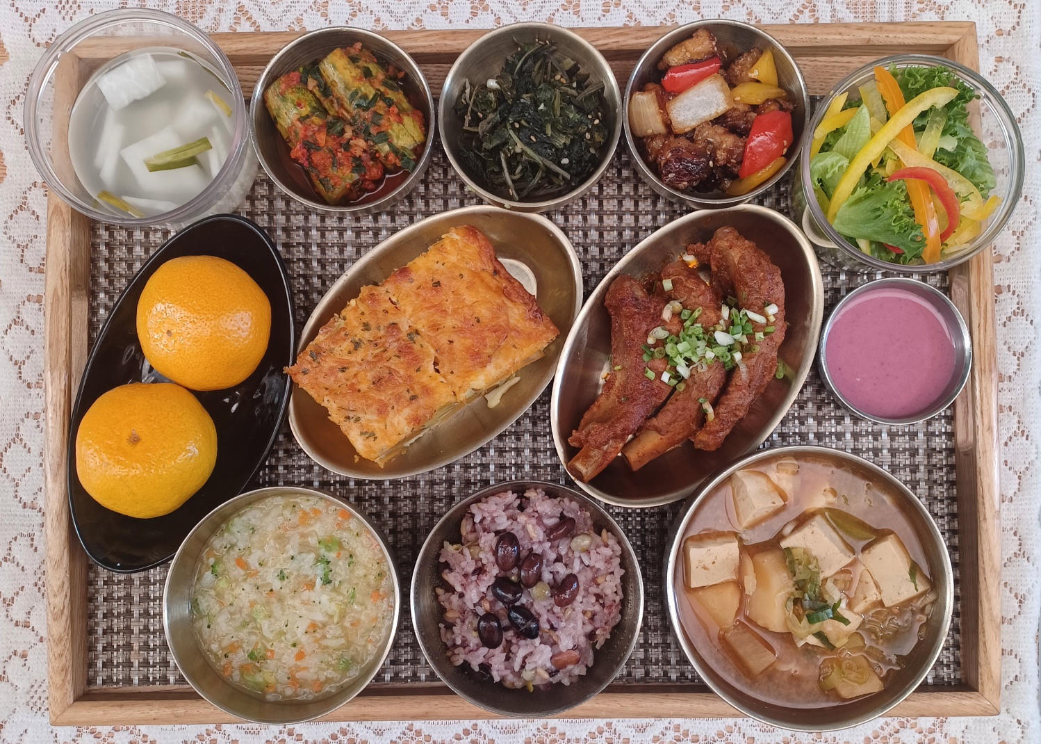 잡곡밥/영양죽/된장찌개/등갈비양념조림/고구마프리타타/표고버섯조림/곤드레나물/샐러드&드레싱/오이소박이/나박김치/계절과일
