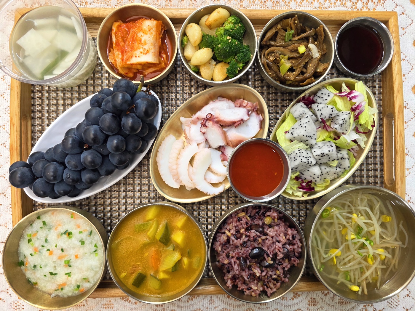 잡곡밥/영양죽/콩나물국/갑오징어&문어*초장/카레소스/브로컬리마늘볶음/건가지나물/용과샐러드&드레싱/포기김치/나박김치/계절과일