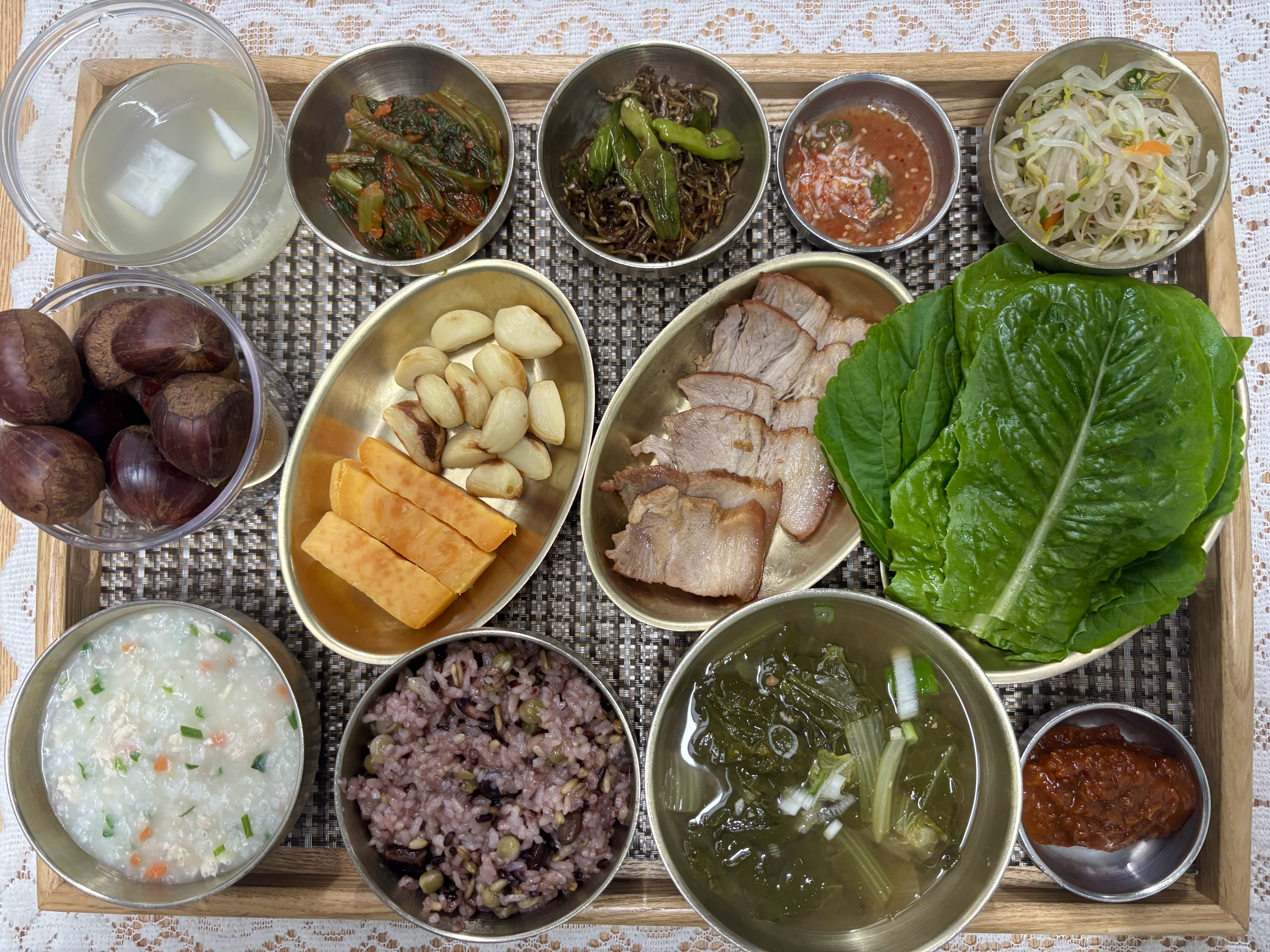 잡곡밥/영양죽/얼갈이된장국/한방수육&새우젓/모듬쌈*쌈장/꽈리고추멸치볶음/숙주나물/갓김치/나박김치/숙고구마&숙마늘/찐밤