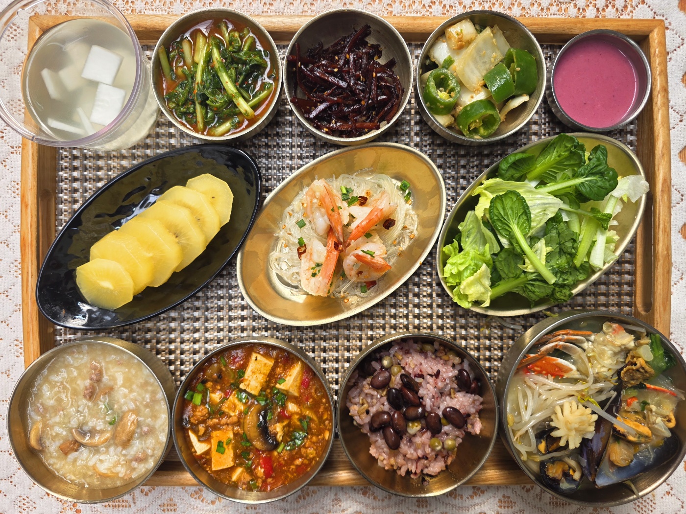 잡곡밥/영양죽/백짬뽕국/새우마늘찜/마파두부/우엉조림/아삭고추무침/그린샐러드&드레싱/포기김치/나박김치/계절과일