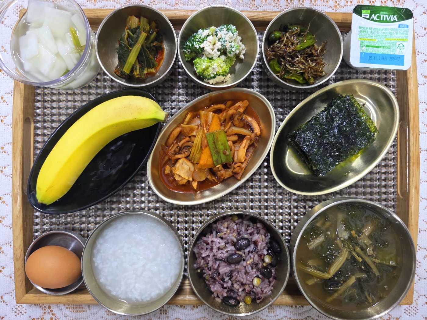 잡곡밥/죽/시래기된장국/오징어볶음/브로컬리두부무침/멸치조림/들기름김/갓김치/나박김치/바나나/계란/요거트