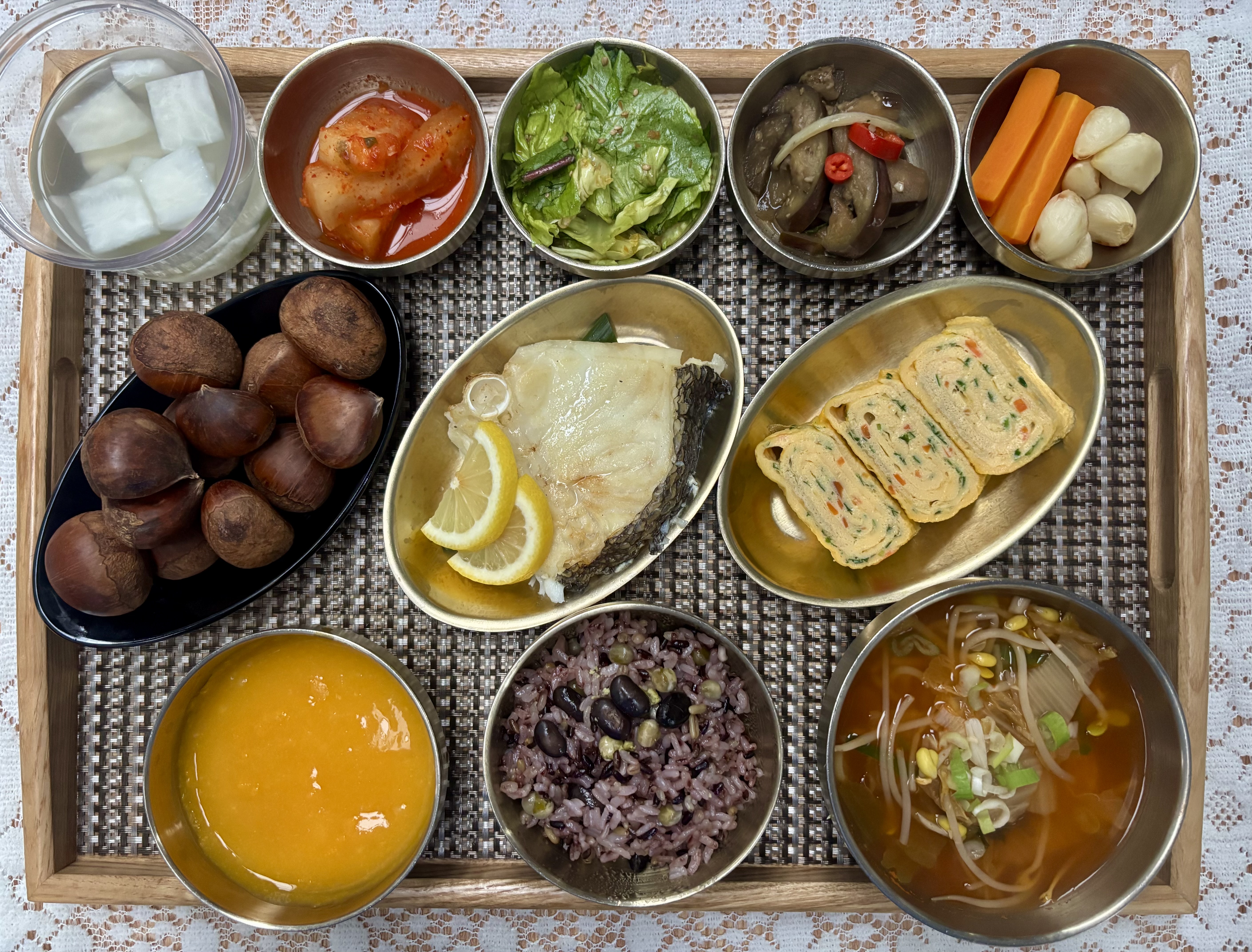 잡곡밥/영양죽/김치콩나물국/메로구이/계란말이/가지나물/쌈채소생채/석박지/나박김치/숙당근&숙마늘/찐밤