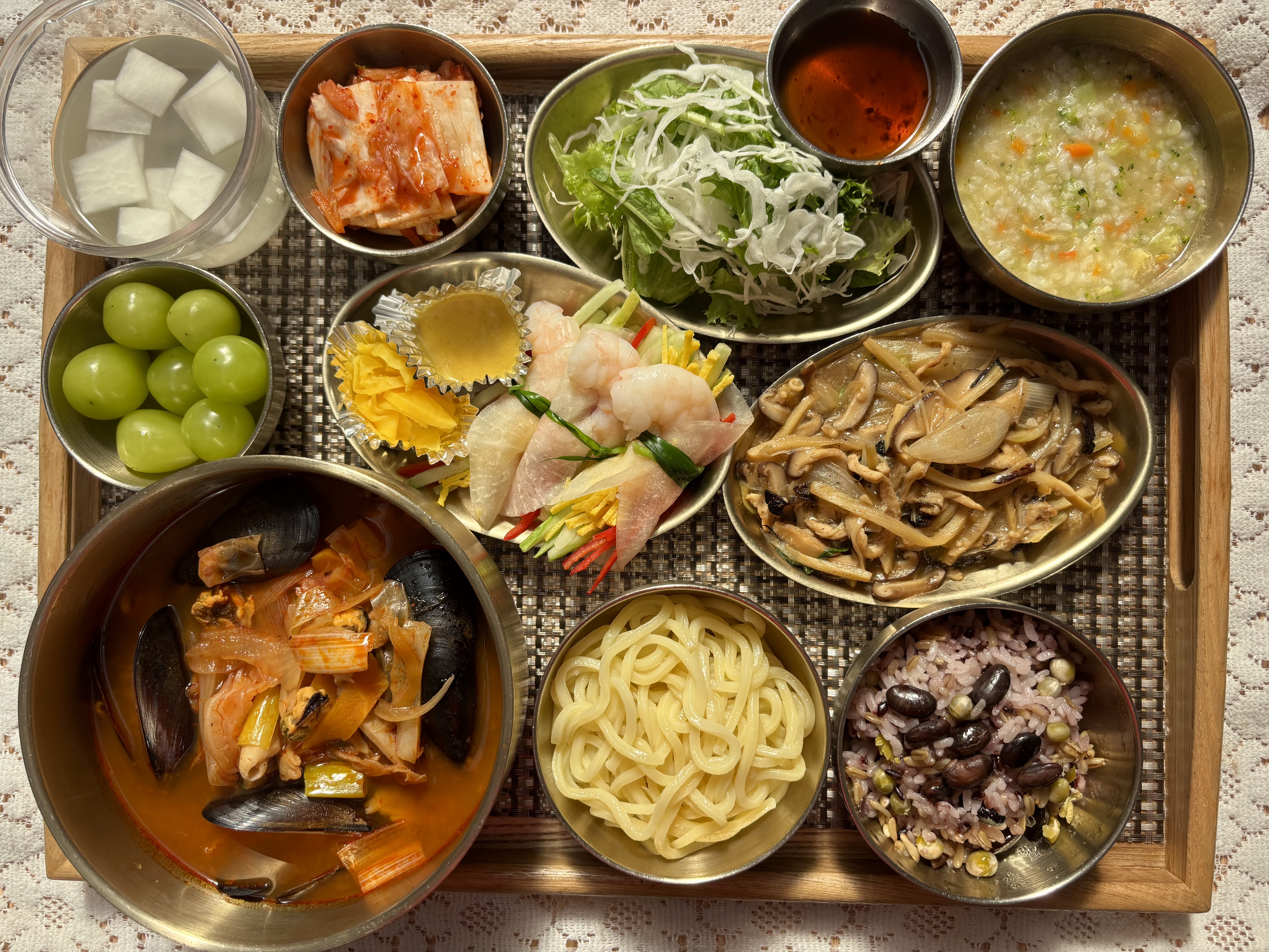 잡곡밥/영양죽/짬뽕국/유산슬/새우야채무쌈&연겨자/미니중화면/꼬들단무지/루꼴라샐러드&드레싱/포기김치/나박김치/계절과일