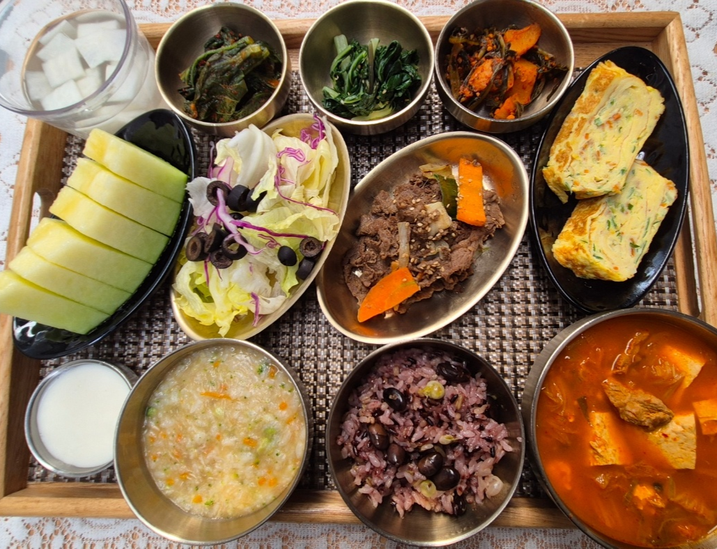 잡곡밥/영양죽/김치찌개/소불고기/계란말이/알타리지짐/근대나물/올리브샐러드&드레싱/열무김치/나박김치/계절과일