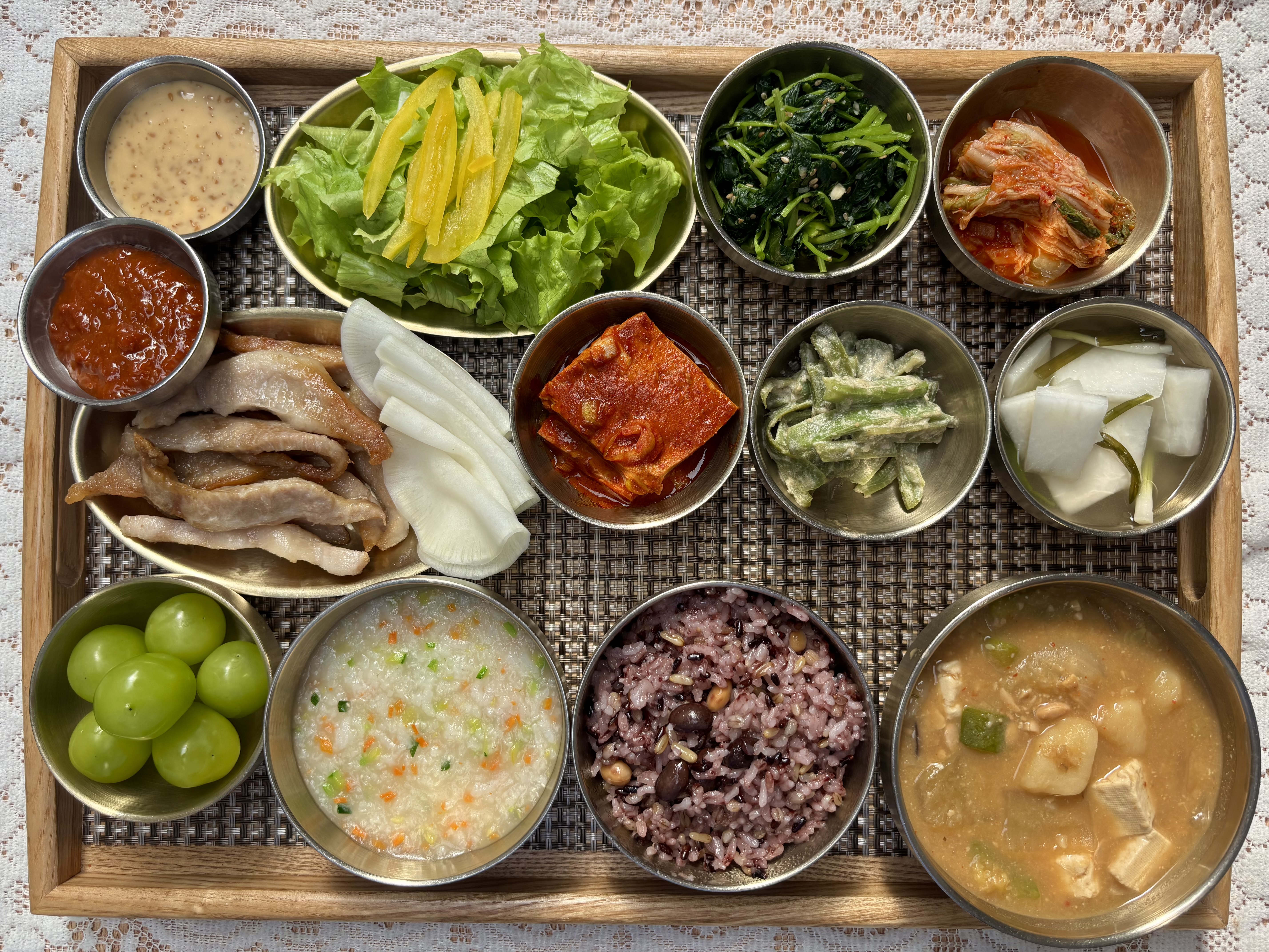 잡곡밥/영양죽/청국장/항정살구이&쌈무*쌈장/두부조림/궁채들깨볶음/참나물/파프리카샐러드&드레싱/포기김치/나박김치/계절과일