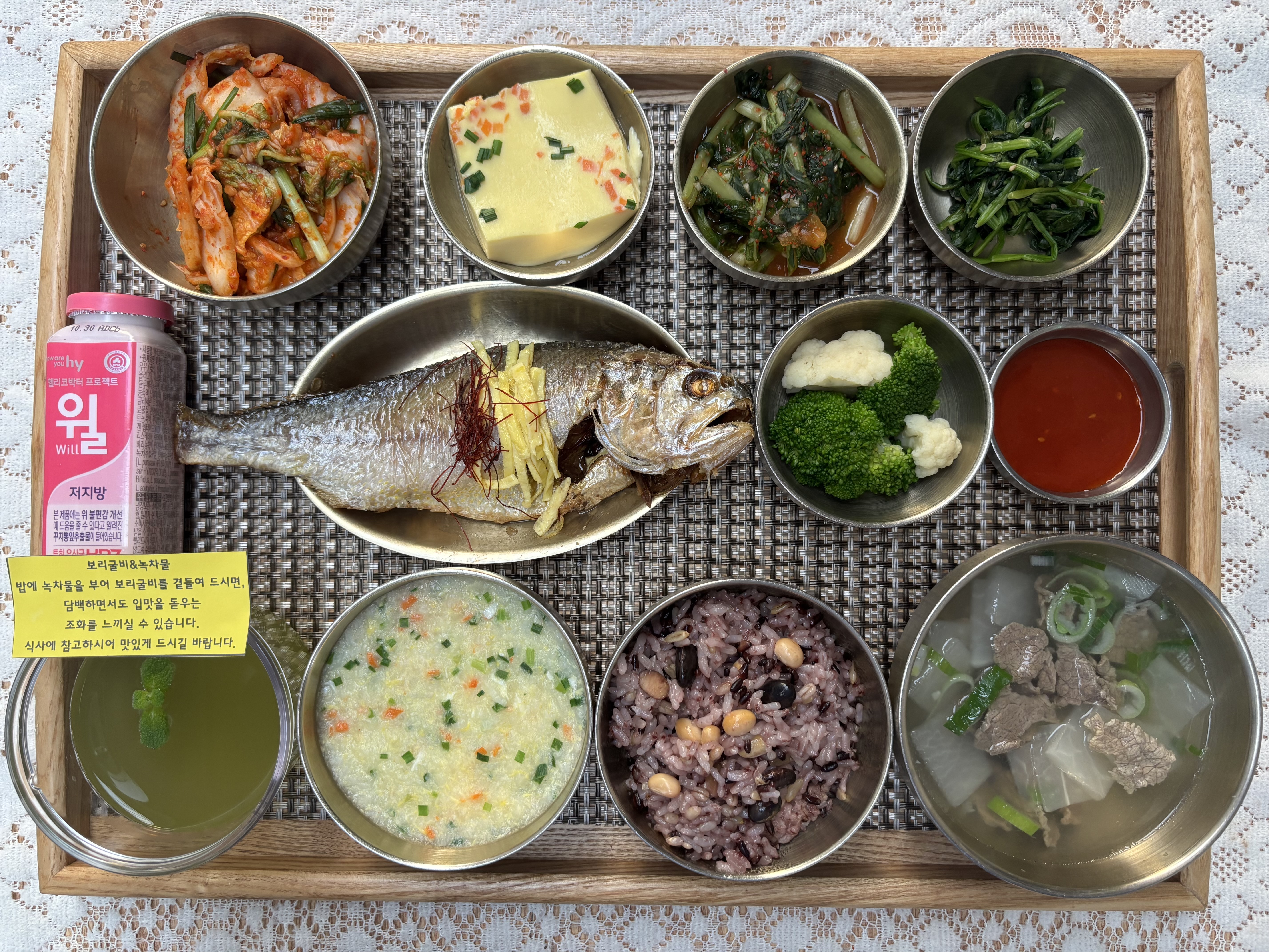 잡곡밥/영양죽/한우무국/보리굴비&녹차물/계란찜/배추겉절이/시금치나물/열무김치/나박김치/숙브로컬리&숙컬리플라워/저지방윌