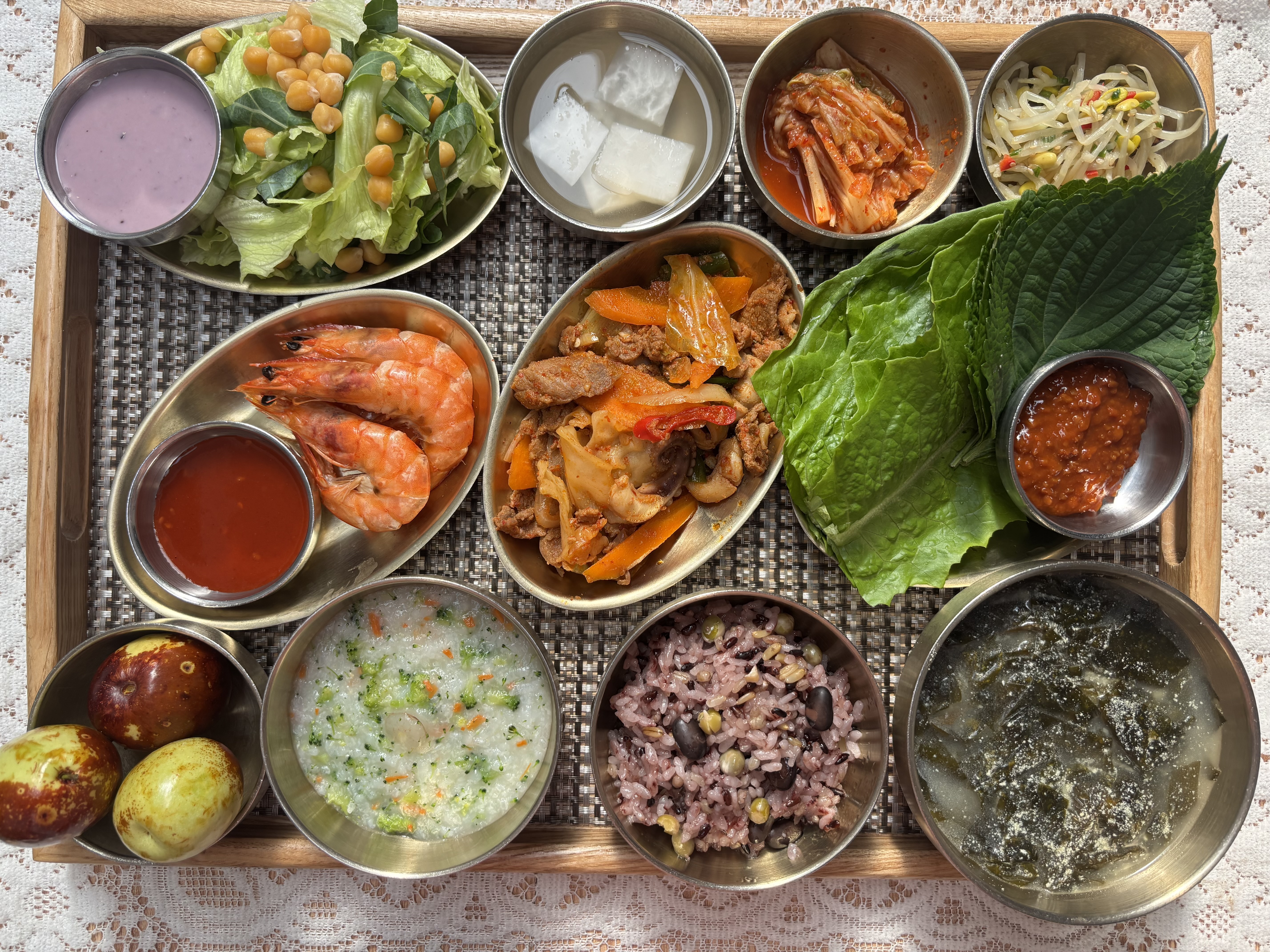 잡곡밥/영양죽/들깨미역국/쭈꾸미제육두루치기/대하소금구이&초장/콩나물무침/쌈채소&쌈장/병아리콩샐러드&드레싱/포기김치/나박김치/계절과일