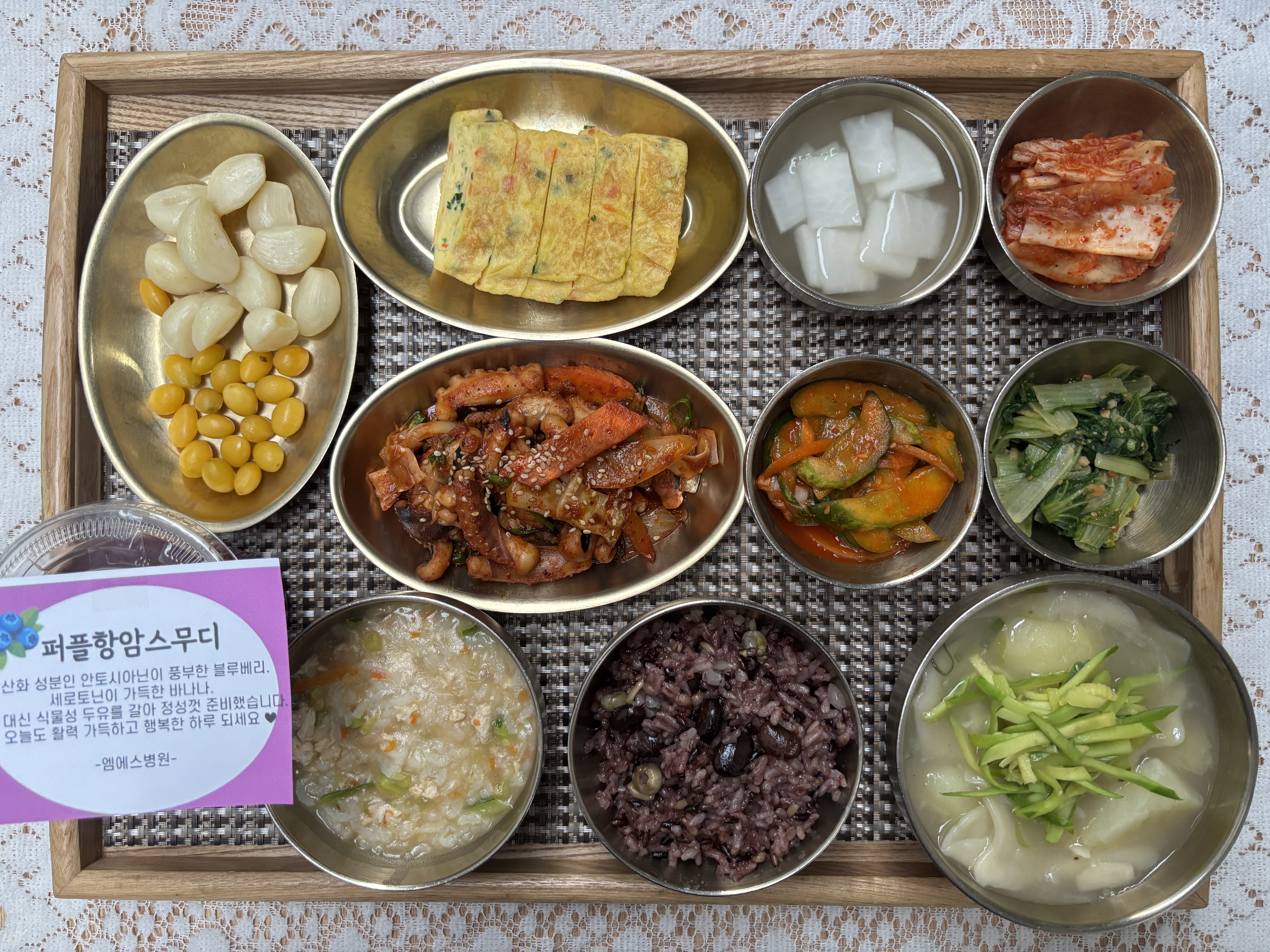 잡곡밥/영양죽/수제비국/낙지볶음/계란말이/얼갈이된장나물/오이무침/포기김치/나박김치/숙은행&숙마늘/퍼플항암스무디