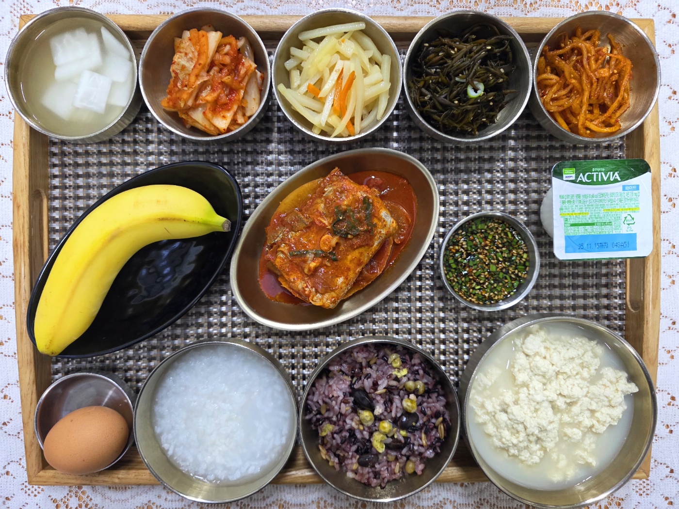 잡곡밥/죽/초당순두부&양념장/갈치무조림/진미채볶음/감자채볶음/톳무침/포기김치/나박김치/바나나/계란/요거트