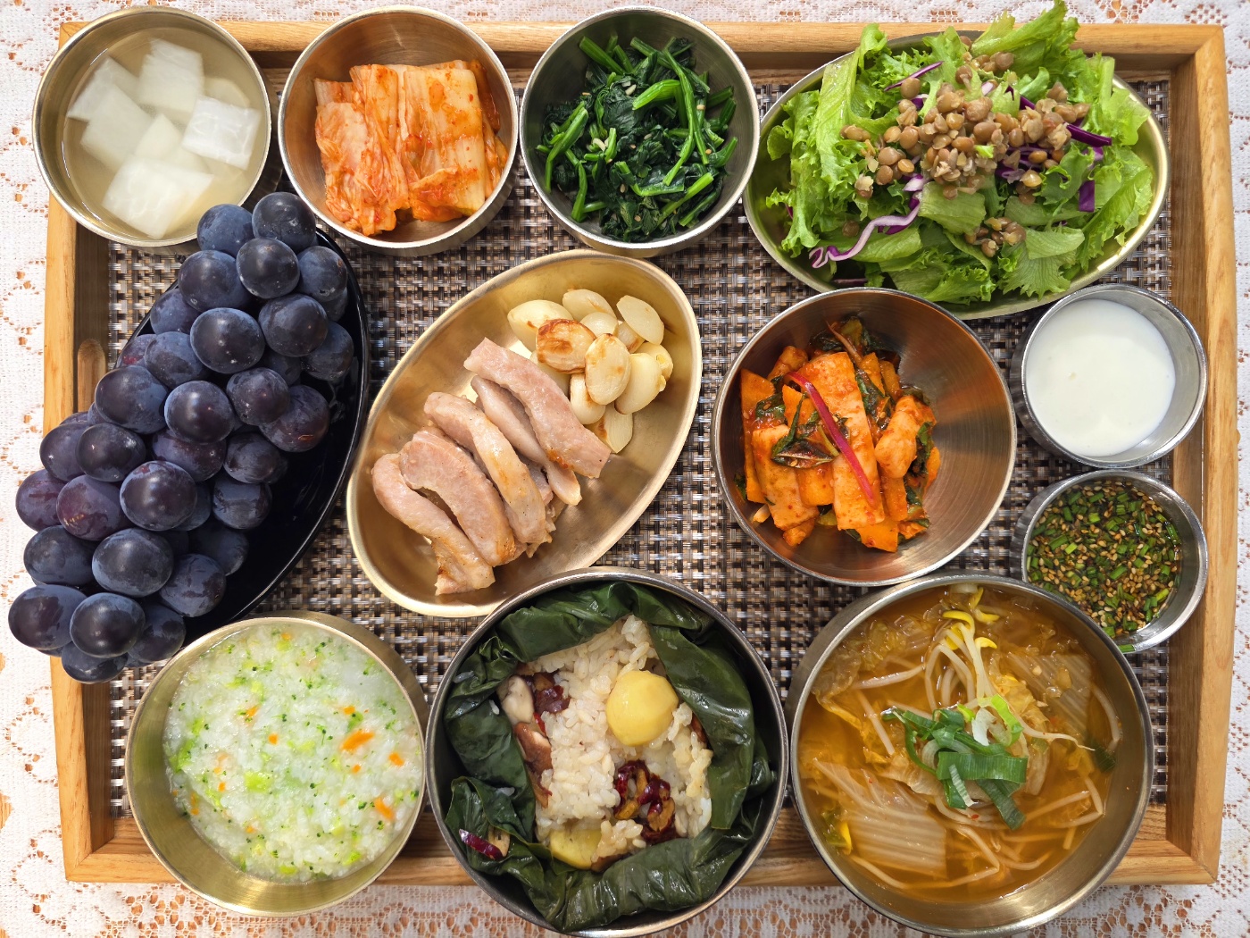 잡곡밥/영양죽/콩나물김치국/연잎밥&양념장/항정살구이/오징어초무침/시금치나물/렌틸콩샐러드&드레싱/포기김치/나박김치/계절과일