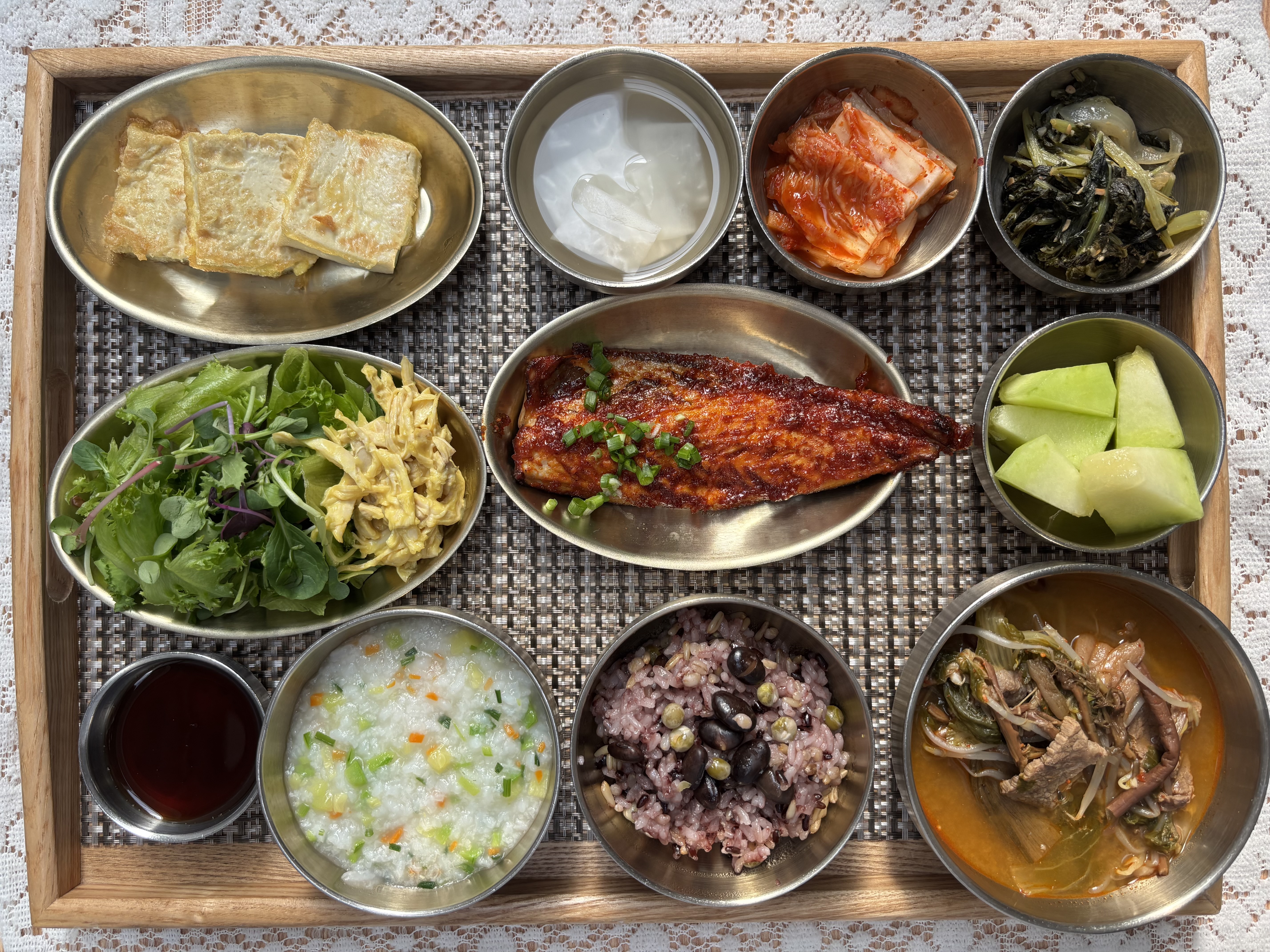 잡곡밥/영양죽/육개장/고갈비/두부계란구이/열무된장나물/미역초무침/닭가슴살샐러드&드레싱/포기김치/나박김치/계절과일