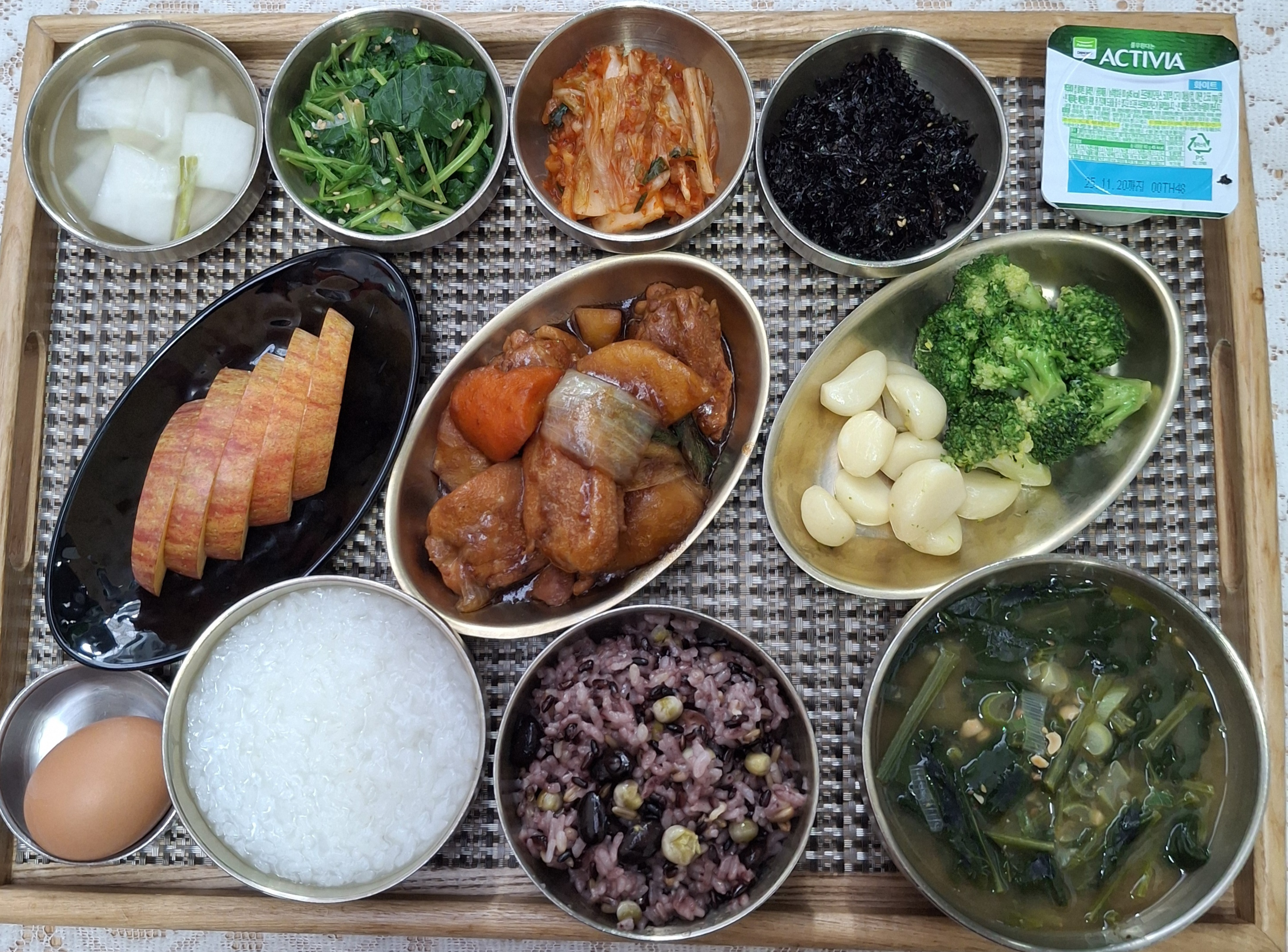 잡곡밥/죽/시금치된장국/순살찜닭/브로컬리마늘볶음/취나물/건파래무침/포기김치/나박김치/사과/계란/요거트