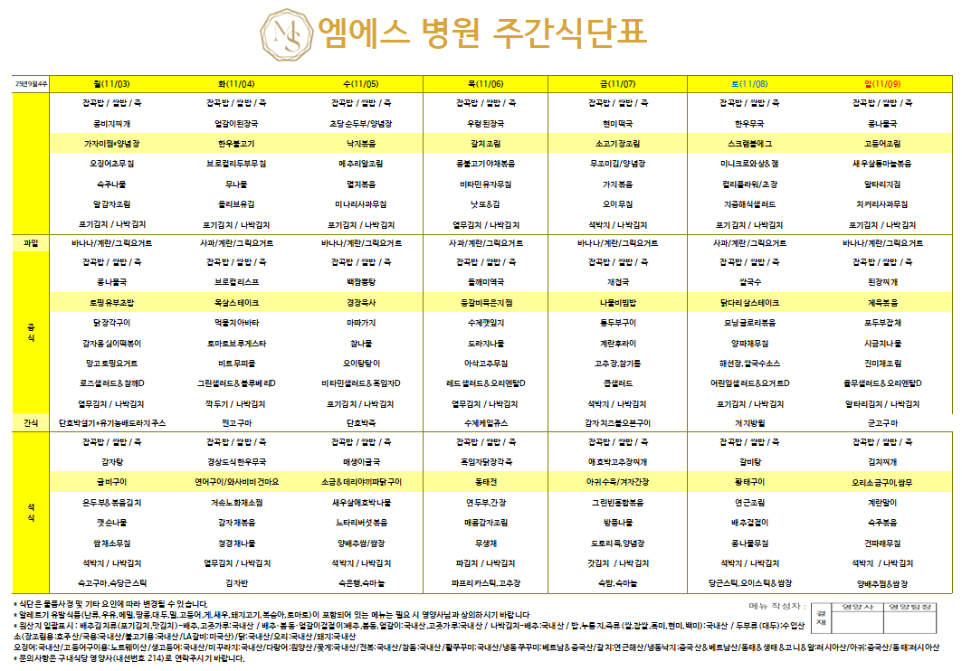 엠에스병원은 환자의 건강 상태와 체질을 충분히 고려하여 주간 단위의 체계적이고 균형 잡힌 맞춤 식단을 설계 및 제공합니다.