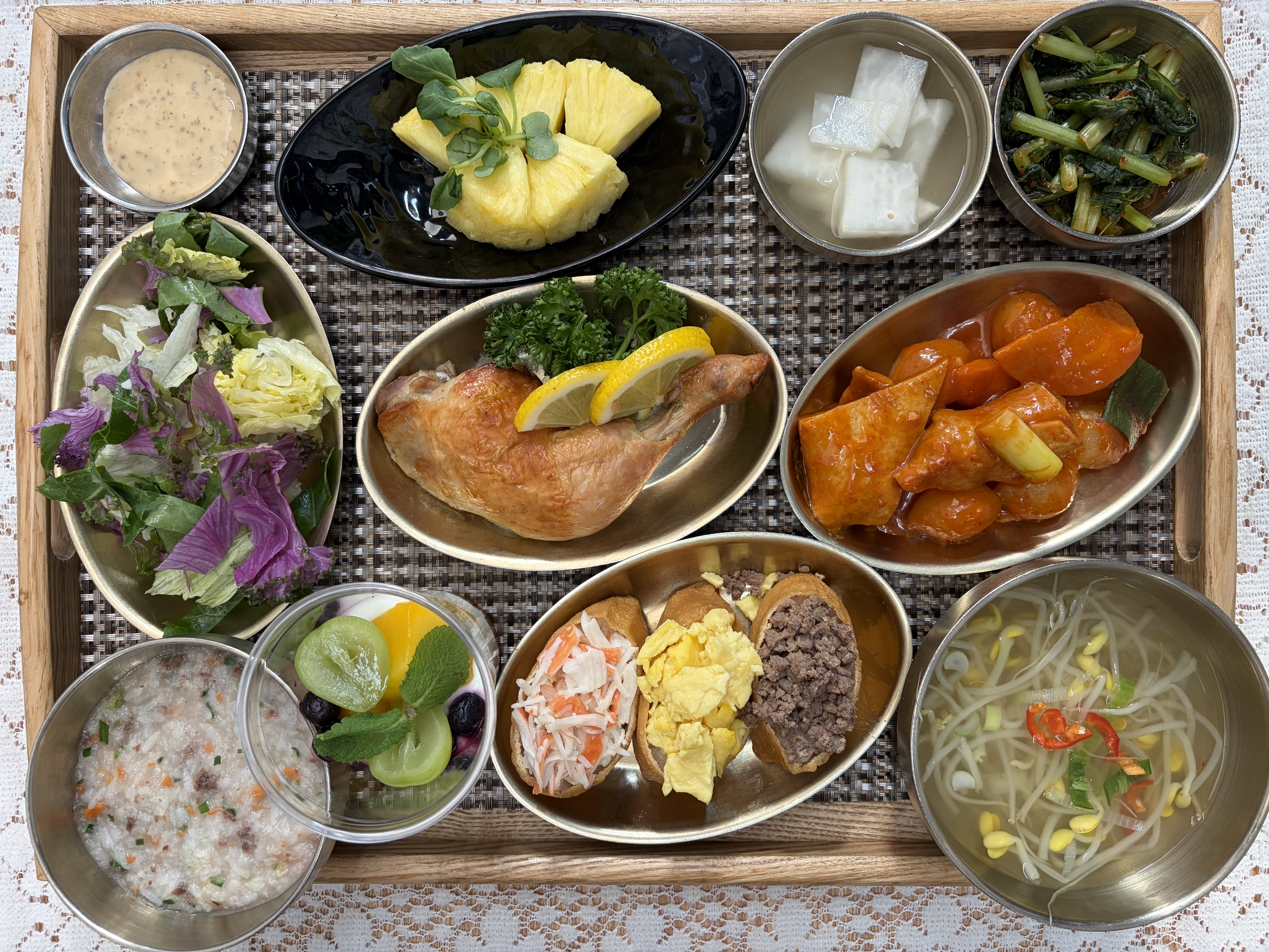잡곡밥/영양죽/콩나물국/토핑유부초밥/닭장각구이/감자옹심이떡볶이/망고토핑요거트/로즈샐러드&드레싱/열무김치/나박김치/계절과일