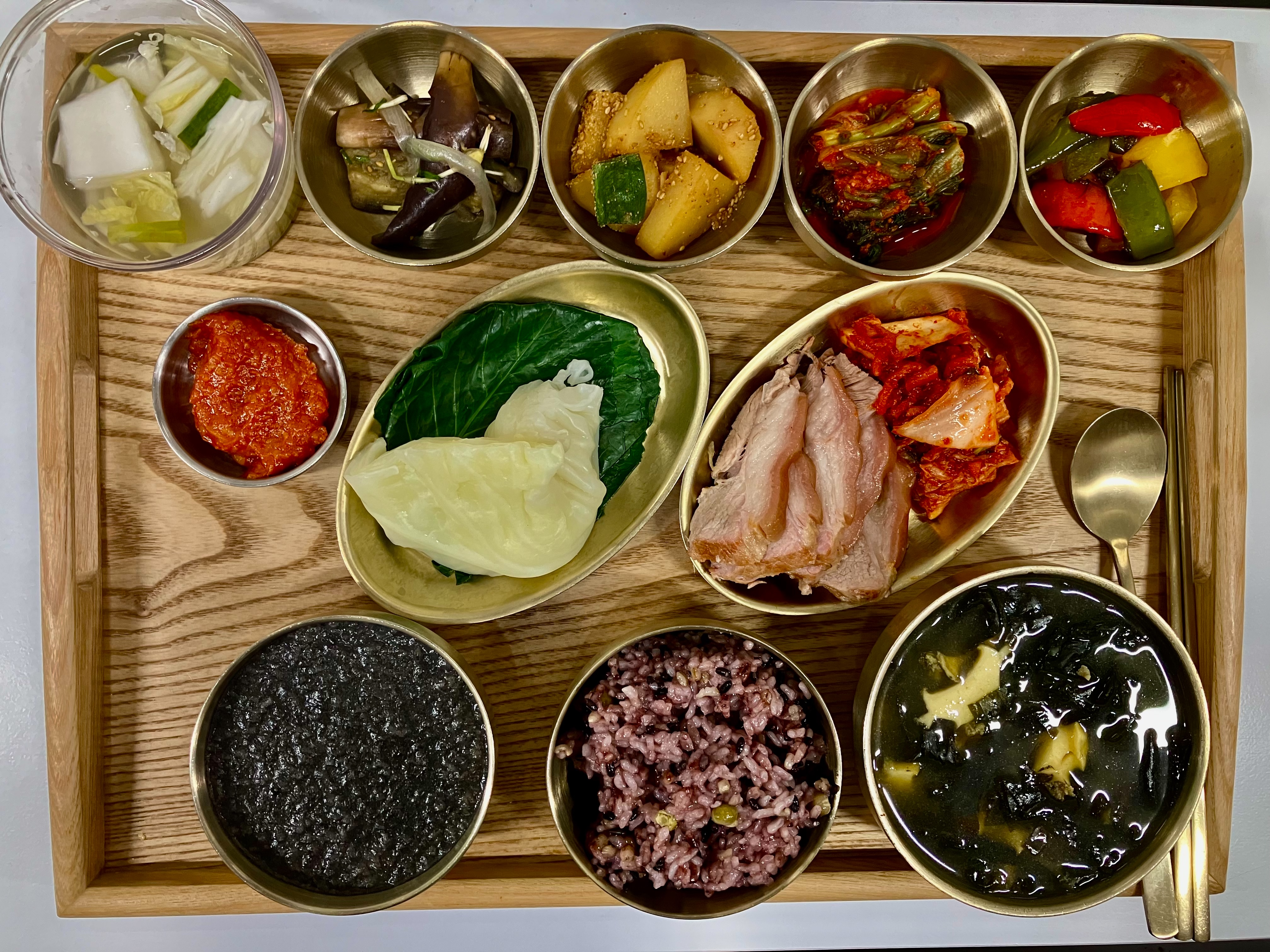 전복미역국/수육&보쌈김치/감자조림/가지나물/양배추&케일쌈&쌈장/갓김치/구운파프리카구이