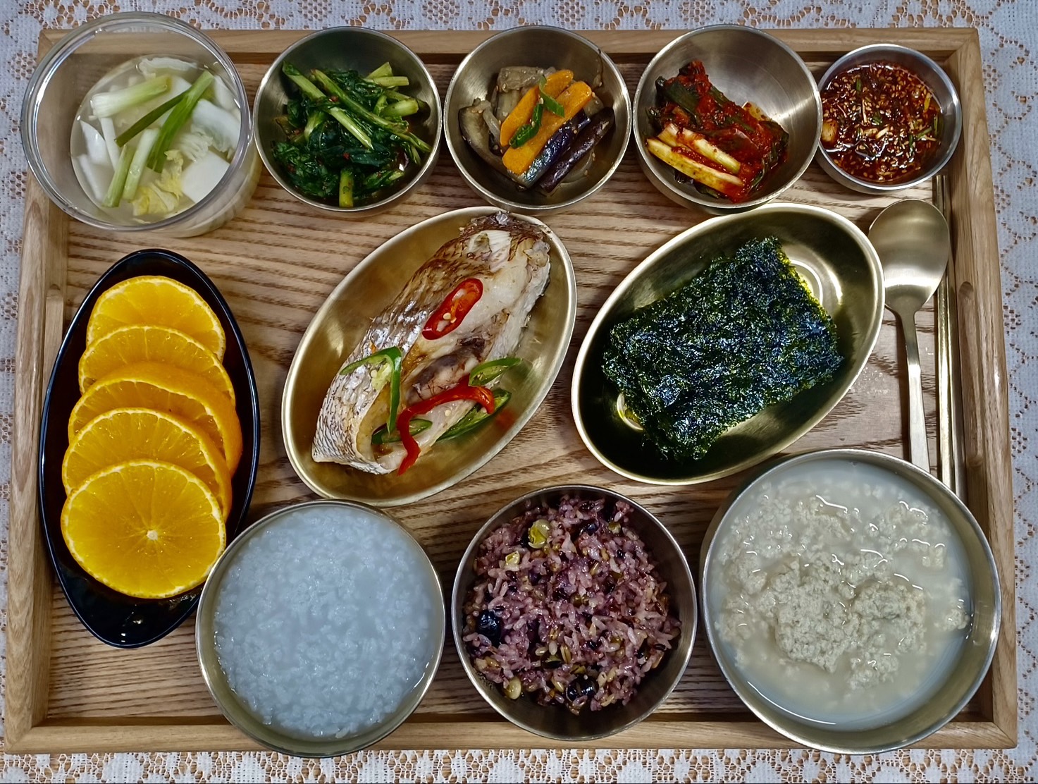 초당두부&양념장/참돔찜/가지볶음/구운김/쪽파김치/포기김치/계절과일